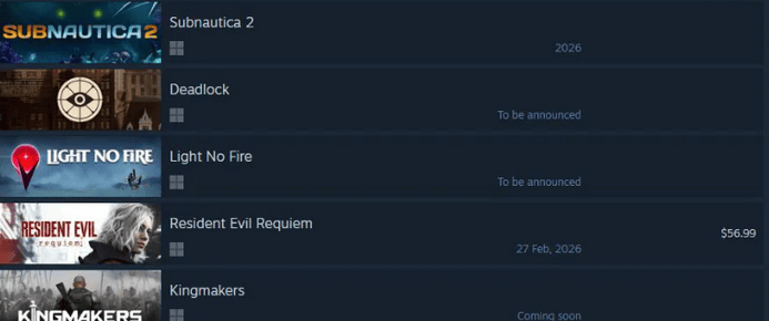 自公布以来,《生化危机9:安魂曲》讨论热度持续上升,现已进入Steam愿望单前五,暂列第四,仅次于《深海迷航2》《死锁》(Deadlock)和《无火之光》,排在第五名的是中世纪策略射击游戏《Kingmakers》。