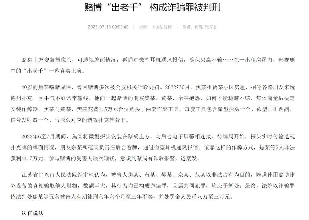2022年6至7月期间,焦某将微型探头安装在赌桌上方,与后台电子屏幕相连接。待牌局开始,探头实时传输克牌的牌面情况,朋友佘某和范某负责在后台看牌,通过微型耳机通风报信。依靠这样的作弊方式,焦某等5人非法获利44.7万元。参与赌博的受害人屡次输钱,意识到赌局有诈后报警,遂案发。