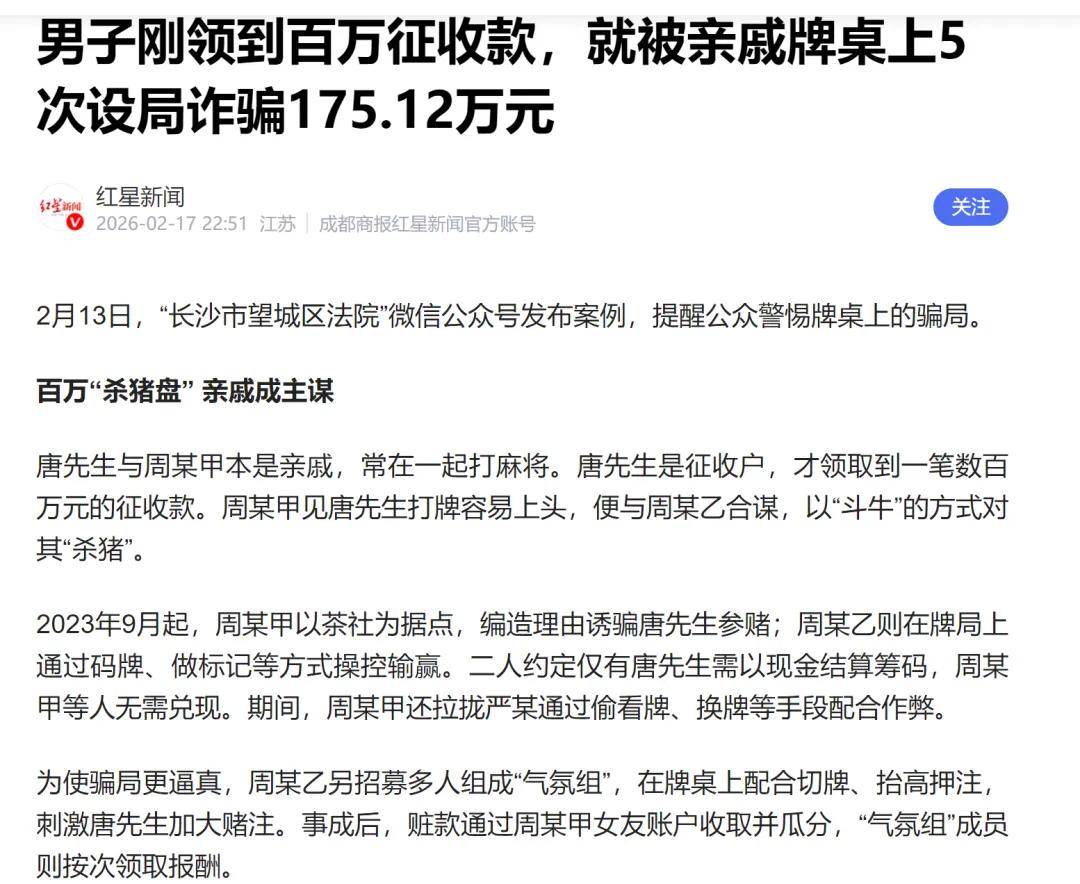 为使骗局更逼真,周某乙另招募多人组成“气氛组”,在牌桌上配合切牌、抬高押注,刺激唐先生加大赌注。事成后,赃款通过周某甲女友账户收取并瓜分,“气氛组”成员则按次领取报酬。