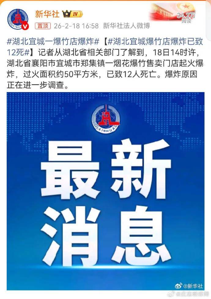 18日14时许,湖北省襄阳市宜城市郑集镇一烟花爆竹售卖门店起火爆炸,过火面积约50平方米,已致12人死亡。爆炸原因正在进一步调查。